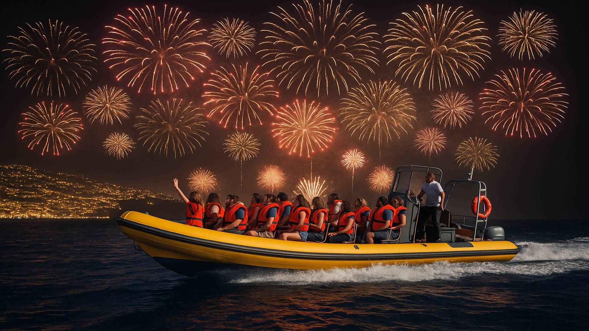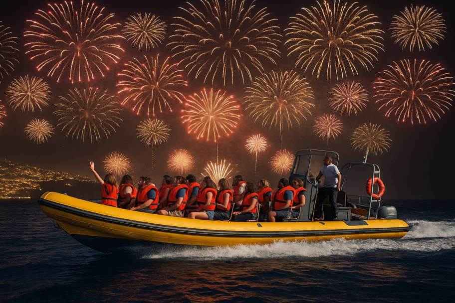 New Year Fireworks from the Sea – Speed Boat Experience Celebrate the arrival of the New Year in an unforgettable way with our 2.5-hour speed boat experience, offering a front-row seat to Madeira’s world-famous fireworks show! 🚤 Adventure Details: Duration: 2 hours and 30 minutes. Location: Departing from Funchal Marina, sailing into the calm waters off the Madeira coast. Highlight: Marvel at the dazzling fireworks from a unique perspective on the sea. 🍾 What’s Included: A glass of premium champagne to toast at midnight. Delicious snacks to keep you refreshed throughout the adventure. Comfortable seating and expert crew ensuring a safe and enjoyable ride. 🎇 Why Choose This Experience? Avoid the crowds and enjoy an exclusive view of the spectacular pyrotechnics. Witness the magical reflection of fireworks on the ocean for a truly unique New Year’s Eve. Create lasting memories with your loved ones in an intimate, festive atmosphere.